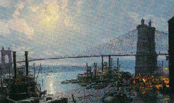 The painting shows the young city’s Riverfront in 1868 at 2nd Street and the mouth of Beargrass Creek. The arriving Cincinnati and Louisville packet WILD WAGONER edges towards the Peoples Line wharf boat in mid-morning as people along Water Street go about their daily business.